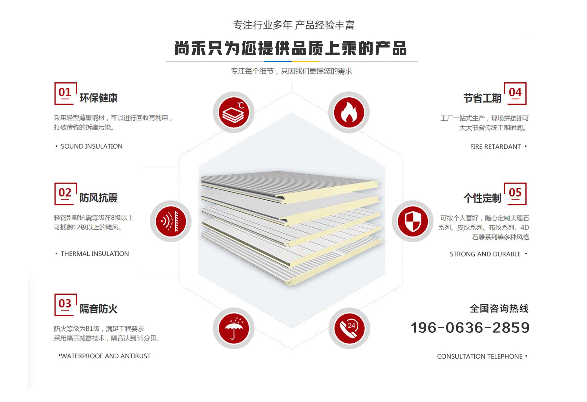 山東尚禾經(jīng)貿(mào)有限公司是集板材設(shè)計(jì)、研發(fā)、生產(chǎn)、施工、一體化的科技公司,并在同行業(yè)中率先通過了質(zhì)量、環(huán)境、安全管理體系認(rèn)證。公司2011年投入資金2000余萬(wàn)元引進(jìn)世界先進(jìn)的聚氨酯節(jié)能板連續(xù)生產(chǎn)線、意大利進(jìn)口發(fā)泡系統(tǒng),采用六組份在線自動(dòng)操作混合澆注技術(shù),在線一次性完成社會(huì)配料中心或工廠的配比混合工藝,并可以根據(jù)溫度在線自動(dòng)調(diào)整,從而生產(chǎn)處與眾不同的高強(qiáng)度、節(jié)能型、綠色環(huán)保的聚氨酯夾芯板。(其使用年限高于同行業(yè)其他品牌5-10年) 公司主要經(jīng)營(yíng)范圍包括聚氨酯夾芯板,PU夾芯板,冷庫(kù)板,潔凈板,聚氨酯冷庫(kù)板,冷庫(kù)保溫板的設(shè)計(jì)、生產(chǎn)、銷售、技術(shù)指導(dǎo)、安裝及一體、以及進(jìn)出口業(yè)務(wù),是中部六省最大的綠色節(jié)能建材生產(chǎn)基地。聚氨酯夾芯板年產(chǎn)200萬(wàn)平方米、PU夾芯板、冷庫(kù)保溫板500萬(wàn)平方米、鏈整產(chǎn)業(yè)綜合實(shí)力,開創(chuàng)了六省至中西部創(chuàng)新型中小名企總部基地,并將著力推進(jìn)中國(guó)中西部地區(qū)集成房屋住宅產(chǎn)業(yè)化發(fā)展進(jìn)程。 科技創(chuàng)新、節(jié)能典范。千萬(wàn)間始終秉承“誠(chéng)信、合作”的企業(yè)文化精髓,長(zhǎng)期致力于鋼板材結(jié)構(gòu)節(jié)能建筑產(chǎn)業(yè),愿與社會(huì)各界攜手合作,共鑄綠色、環(huán)保美好未來(lái)。 產(chǎn)品具有良好的絕熱、阻燃、隔音、環(huán)保、耐久性能,可廣泛應(yīng)用于工業(yè)、商用建筑內(nèi)外墻、以及民用建筑外墻保溫、空調(diào)通風(fēng)系統(tǒng)、專用防火保溫門等領(lǐng)域。 我們始終秉承...
